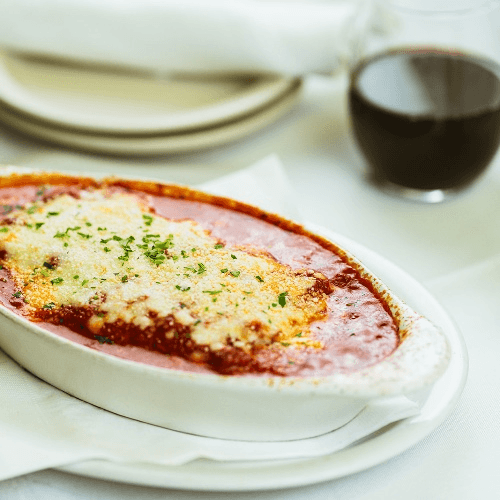 Pasta layered with beef, sausage, asiago, ricotta, mozzarella and baked with bolognese sauce