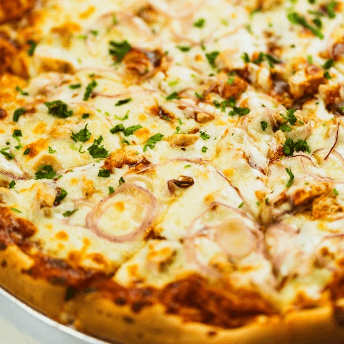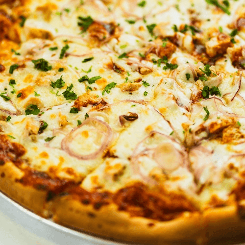 BBQ sauce, chicken, mozzarella, red onions, cilantro