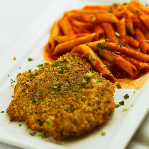 Pan-fried breaded chicken served with penne pasta
