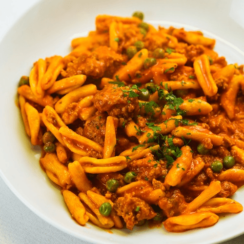 Ricotta pasta with sausage and peas in a pomodoro cream sauce