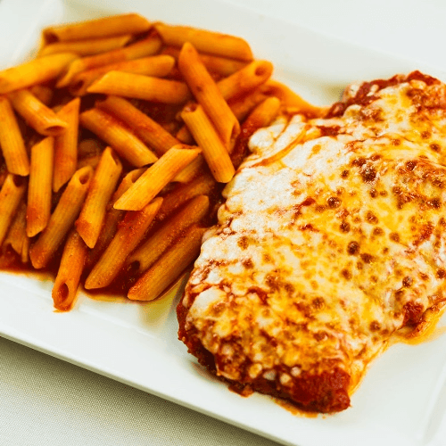 Pan-fried breaded chicken with pomodoro sauce, mozzarella and served with penne pasta