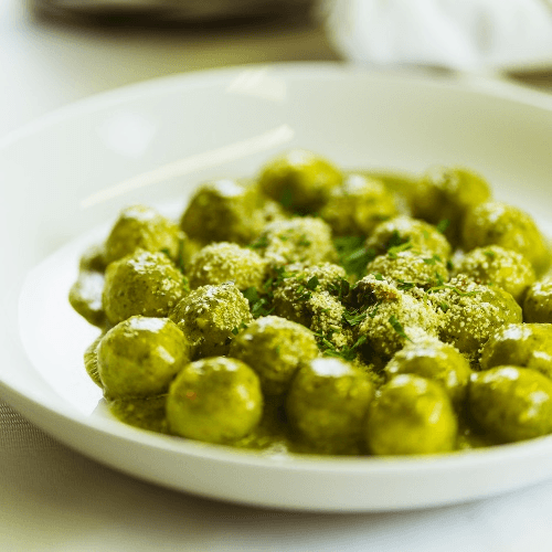 Pancetta, peas, and green onions in a herb butter cream sauce