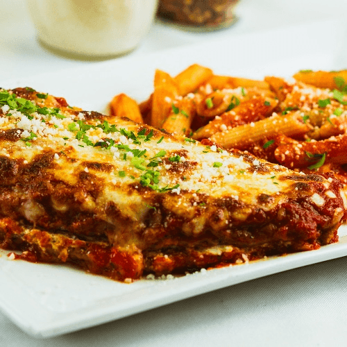 Eggplant layered with ricotta, asiago, mozzarella, baked with pomodoro sauce and served with penne pasta